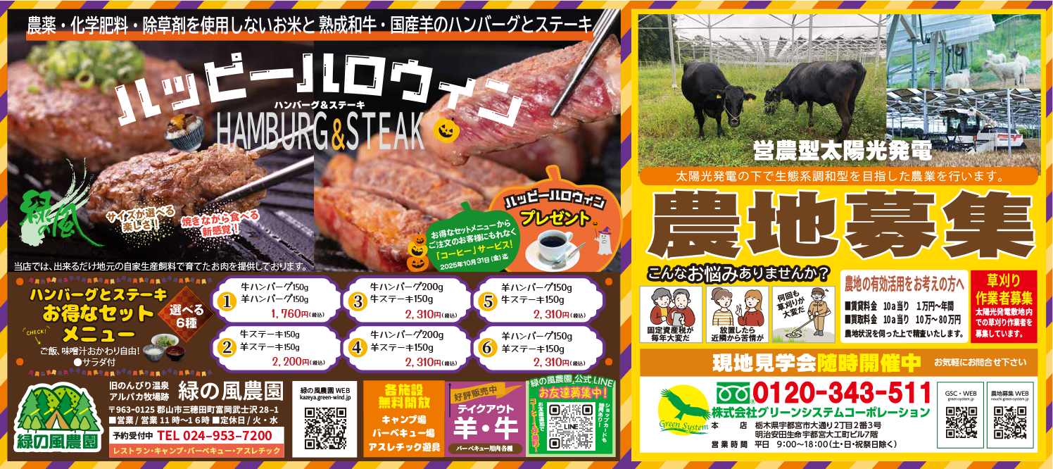 福島民報新聞朝刊に全5段広告掲載! 10月19日(日)福島民報新聞へ全5段広告掲載します。 農地募集広告と緑の風農園「ハッピーハロウィン」企画です。 ハンバーグ&ステーキ緑の風では、10月19日(日)~31日(金)まで お得な6種セットメニューご注文のお客様に、もれなくコーヒーをサービス致します。 日に日に、秋の気配が感じさせる緑の風農園に是非、ご来店ください。