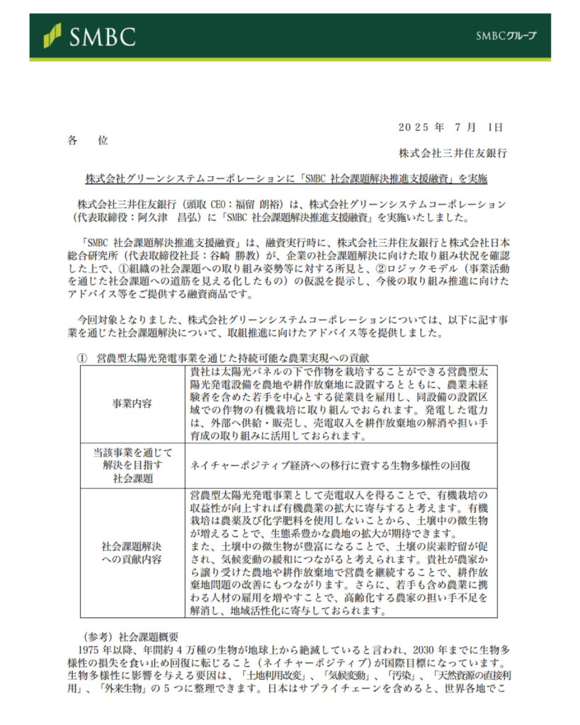 株式会社三井住友銀行様(SMBC)が 株式会社グリーンシステムコーポレーションに「SMBC 社会課題解決推進支援融資」を実施いたしました。