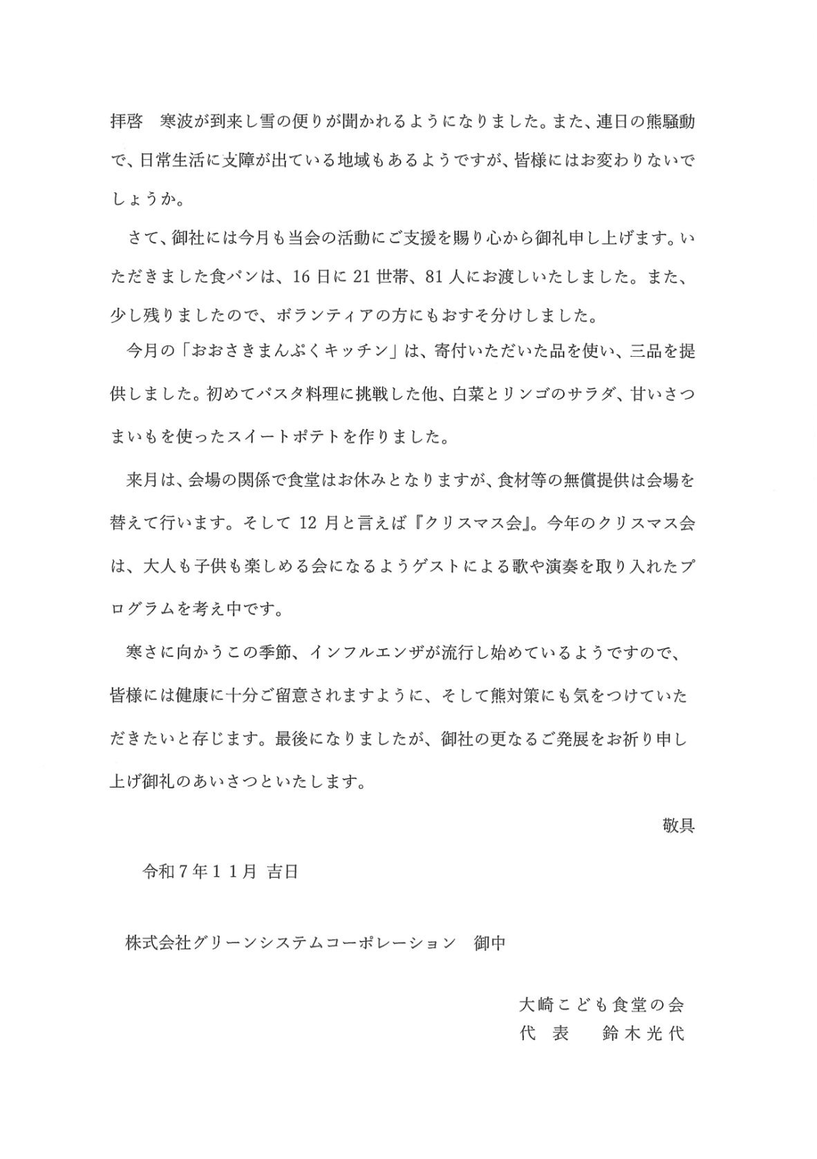 11月は、下記10箇所へ268個の食パンを贈りました。