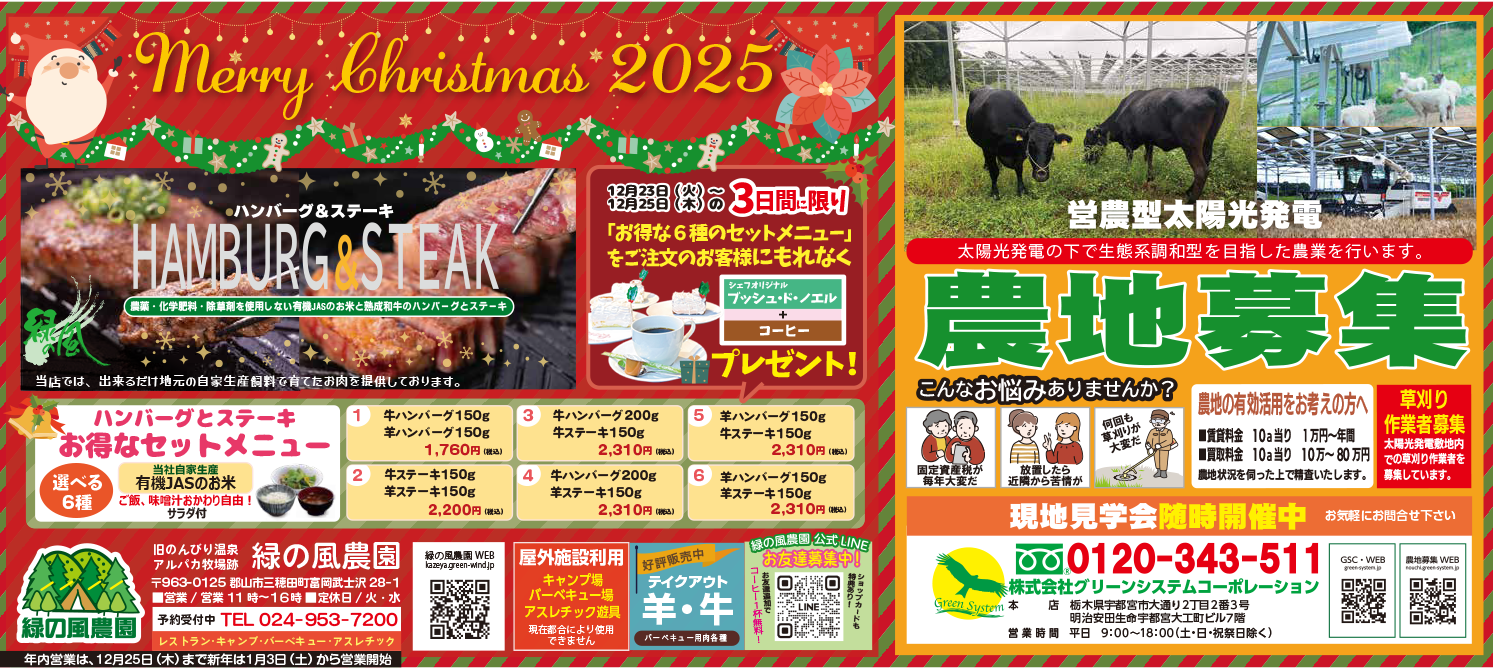 農地募集と緑の風のクリスマス企画を12月19日(金)朝刊へ全5段広告掲載します。