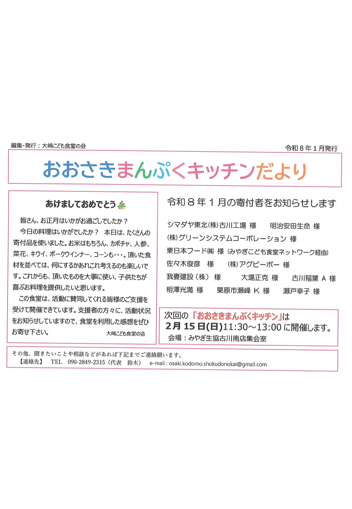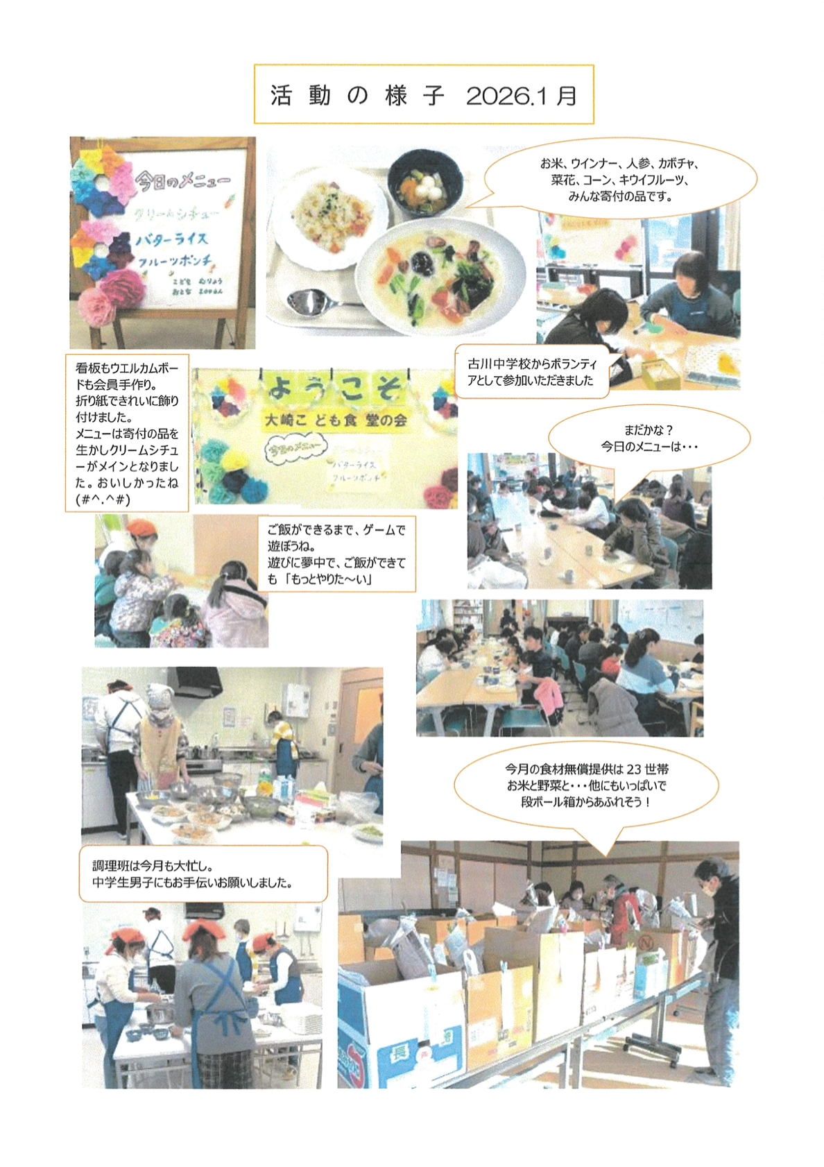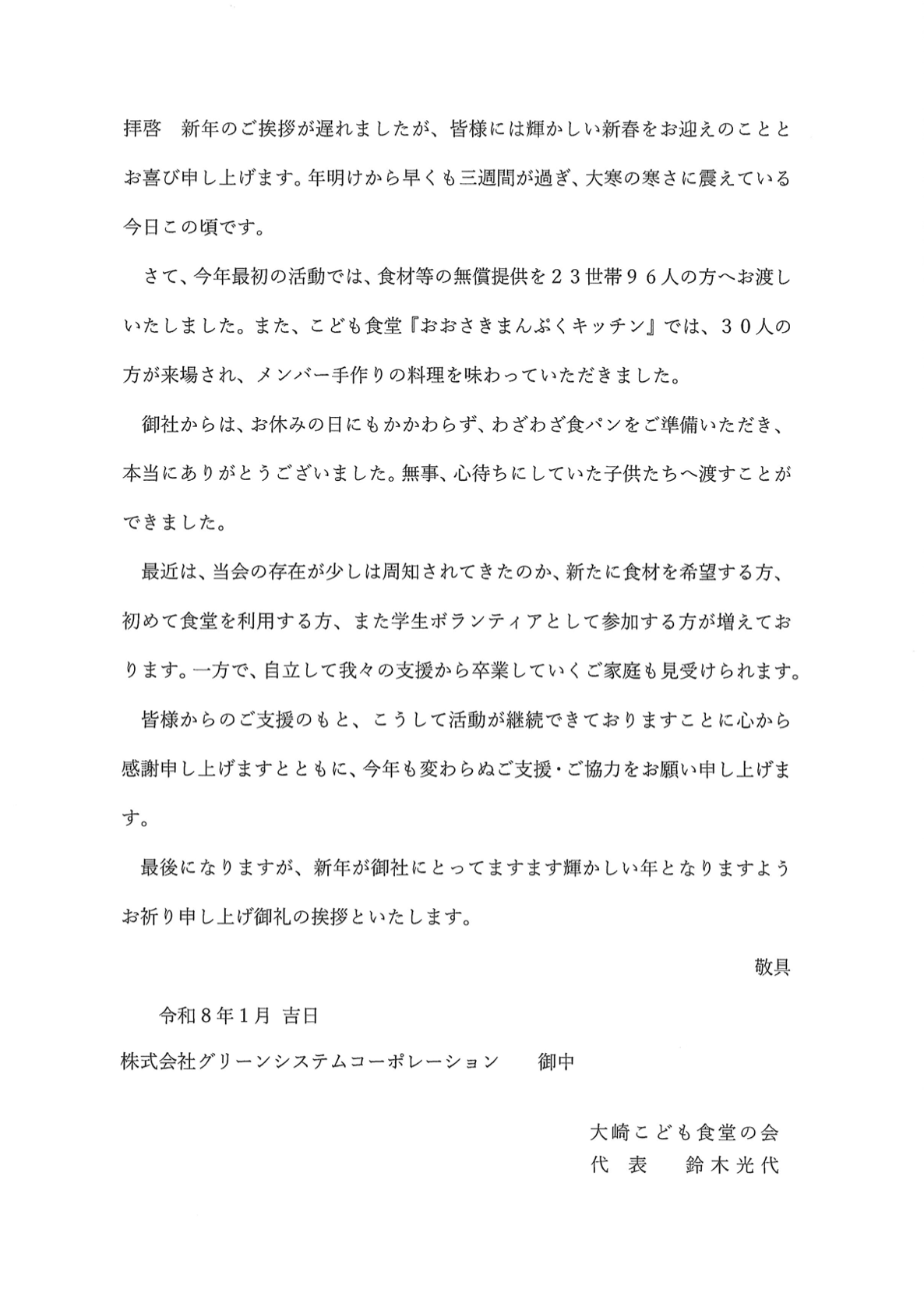子ども食堂から御礼の手紙と活動広報 栃木・福島・宮城の「子ども食堂」へ毎月贈っているグリーンシステム・ソーラーシェアリング圃場で 生産した農薬・化学肥料・除草剤不使用の小麦を使った「食パン」 1月は、下記9箇所へ248個の食パンを贈りました。 本社(栃木) 子ども食堂ネットワークかぬま様 40 YMCAきよはら様 40 MAKANA様 8 ひより様 20 エキナカ子ども食堂様 40 仙台 大崎市 まんぷく食堂様 30 郡山 しおりっち子供食堂様 30 キッズスタジオポルタ様 10 わらりら子供食堂様 30
